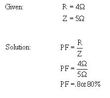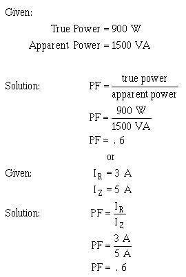 The power factor can now be found using either apparent power and true power or resistance and impedance. The mathematics in this example is easier if you use impedance and resistance.