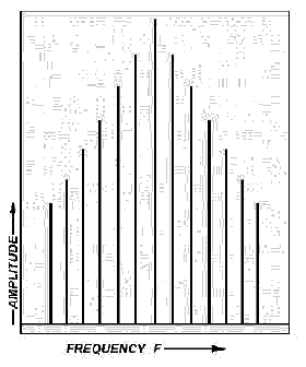 The spectrum analyzer accepts an electrical input signal and displays the frequency and amplitude of the signal on a CRT. On the vertical, or Y, axis, the amplitude is plotted. The frequency would then be found on the horizontal, or X, axis. The overall pattern of this display (the figure below) indicates the proportion of power present at the various frequencies within the spectrum analyzer (fundamental frequency with sideband frequencies).