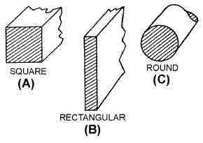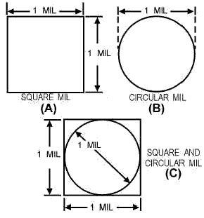 The square mil of electrical conductors is a unit of measurement used to determine the cross-sectional area of square or rectangular electrical conductors (views A and B of the illustration).
