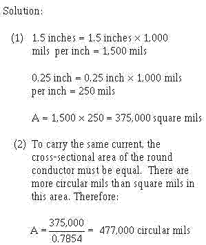 Problem: A rectangular conductor is 1.5 inches wide and 0.25 inch thick. What is (1) its area in square mils and (2) in circular mils? What size of round conductor is necessary to carry the same current as the rectangular bar?