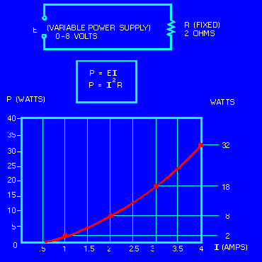 The illustration below shows a basic circuit using a source that can be varied from 0 to 8 volts and a graph that indicates the relationship between voltage and power.