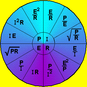 The pie chart below is a summary of 12 basic formulas you should know. The four quantities E, I, R, and P are at the center of the figure. Adjacent to each quantity are three segments. Note that in each segment, the basic quantity is expressed in terms of two other basic quantities, and no two segments are alike.