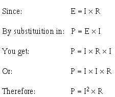 Referring to the following illustration, note that P also varies as the square of current just as it does with voltage. Thus, another formula for power, with current and resistance as its factors, is P = I squared x R.