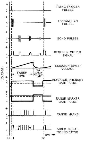 The figure below shows the time relationships of the various waveforms in a typical radar set. The timing trigger pulses are applied to both the transmitter and the indicator. When a trigger pulse is applied to the transmitter, a short burst of transmitter pulses (rf energy) is generated.