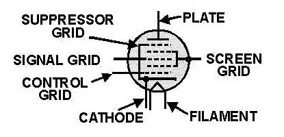 Another type of special-purpose tube is the MULTI-ELECTRODE tube. In some applications, tubes require more than the three grids found in conventional tubes. In some cases, up to seven grids may be used. These types of tubes are called multi-electrode tubes and are normally classified according to the number of grids they contain. An example of this is illustrated below. Here, you see a tube with five grids; hence, its name is "pentagrid." The application of these tube types is beyond the scope of this module, but because multi-electrode tubes have been commonly used you should be aware of their existence.