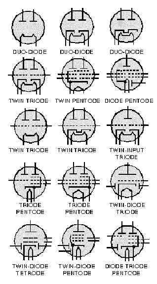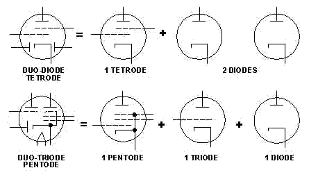 One of the probems associated with electron tubes is that they are bulky. The size of an electron tube circuit can be decreased by enclosing more than one tube within a single envelope, as mentioned in a previous tutorial. There is a large variety of tubes that can be combined into this grouping of special purpose tubes called MULTI-UNIT tubes. The picture below illustrates the schematic symbols of a few of the possible combinations found in multi-unit tubes.