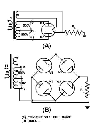 In the conventional full-wave circuit,view (A), the peak voltage from the center tap to either X or Y is 500 volts. Since only one diode can conduct at any instant, the maximum voltage that can be rectified at any instant is 500 volts. Therefore, the maximum voltage that appears across the load resistor is nearly, but never exceeds, 500 volts (because of the small voltage drop across the tube).