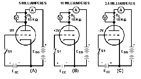 By applying +3 volts to the grid, the voltage drop across RL was increased by 50 volts (from the original 50 volts to 100 volts). In view (C), -3 volts has once again been applied to the control grid. Once again plate current decreases to 2.5 milliamperes, and the voltage drop across RL drops to 25 volts.